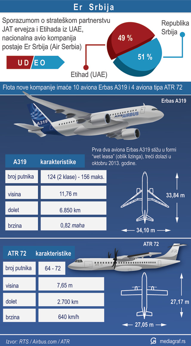 Strateškim partnerstvom JAT ervejza i Etihada iz UAE biće formirana nova kompanija, Er Srbija. Udeo Republike Srbije u novoj kompaniji biće 51 %, a Etihada 49 %.