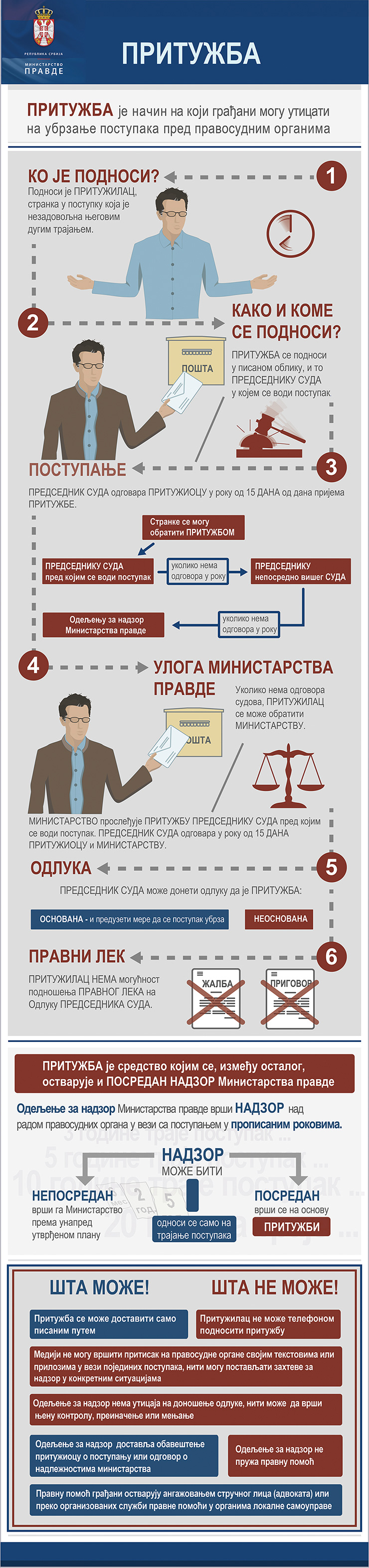 Infografika o primeni Pritužbe, načinu na koji građani mogu uticati na ubrzanje postupaka pred pravosudnim organima..